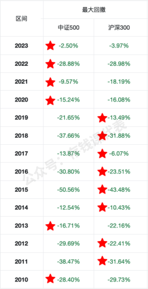 我分别计算了2010年以来,沪深300和中证500每年的收益情况和回撤情况,并为每年度表现最好的标记上星星🌟。